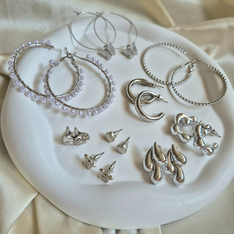 شامل ۹ جفت گوشواره خاص و ترند، با طراحی متنوع – از مرواریدی تا حلقهای و فانتزی 🤍💛