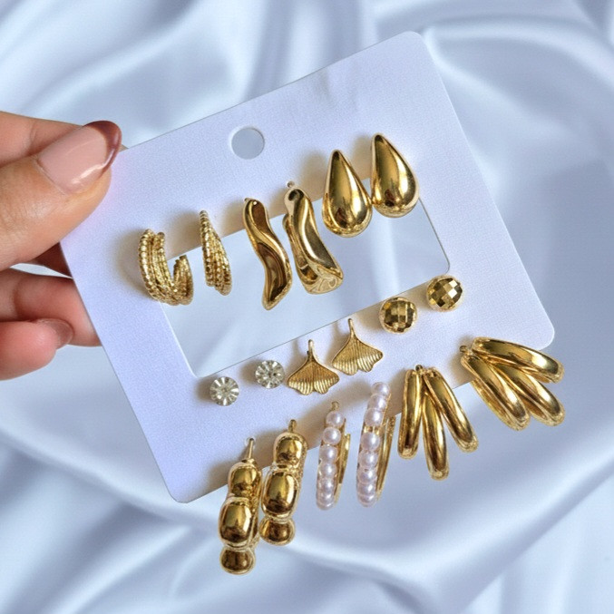 شامل ۹ جفت گوشواره خاص و ترند، با طراحی متنوع – از مرواریدی تا حلقهای و فانتزی 🤍💛
